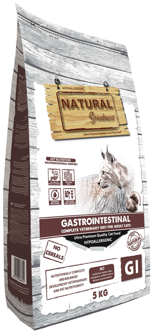 Natural Greatness Gastrointestinal es una receta hipoalergénica, completa y sin cereales destinada a gatos adultos con trastornos de la absorción intestinal. Se caracteriza por la presencia de prebióticos FOS y MOS para la mejora en la absorción de nutrientes, así como de una alta digestibilidad gracias a su mayor contenido de sodio y potasio, además de proteínas de alto valor biológico de origen animal.