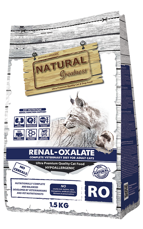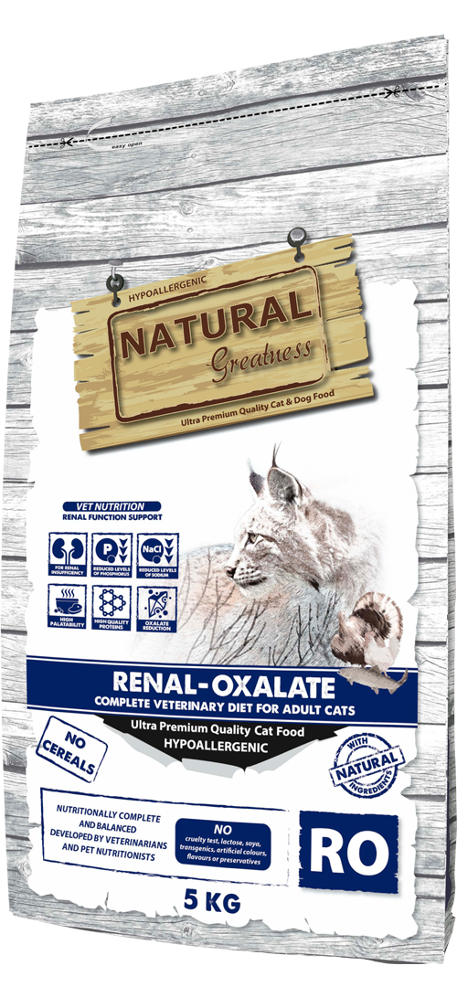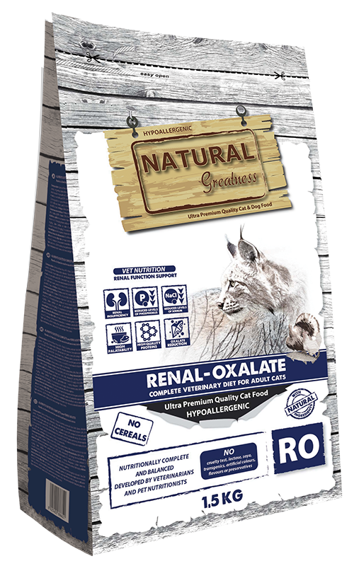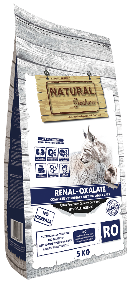 Natural Greatness Renal-Oxalate es una receta hipoalergénica, completa y sin cereales destinada a gatos adultos con insuficiencia renal crónica. Este alimento ayuda a la preservación de la función renal y evita la reaparición de cálculos de oxalato mediante la alcalinización de la orina y la reducción del calcio y de la vitamina D. Incluye proteínas de alta calidad y óptima digestibilidad. Además, debido a su bajo contenido en sodio, esta receta constituye una ayuda a la función uruinaria y cardíaca en caso de insuficiencia cardíaca crónica.