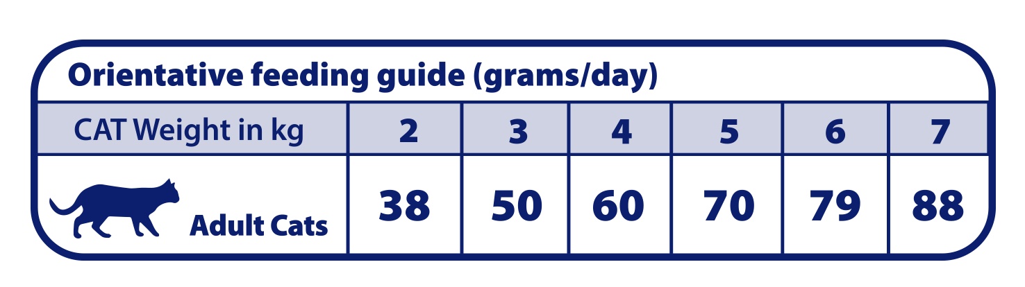 Aditivos nutricionales: Vitamina A 15 000 UI/kg, vitamina D3 500 UI/kg, vitamina E 500 mg/kg, vitamina C 150 mg/kg. Hierro (sulfato de hierro II monohidratado) 75 mg/kg, Yodo (yoduro potásico) 3,5 mg/kg, Cobre (sulfato de cobre (II) pentahidratado) 10 mg/kg, Manganeso (sulfato manganoso monohidratado) 7,5 mg/kg, Zinc (óxido de zinc) 120 mg/kg, Selenio (selenito sódico) 0,12 mg/kg y Taurina 2000 mg/kg. Aditivos tecnológicos: Antioxidantes: Extractos de tocoferoles de aceites vegetales.